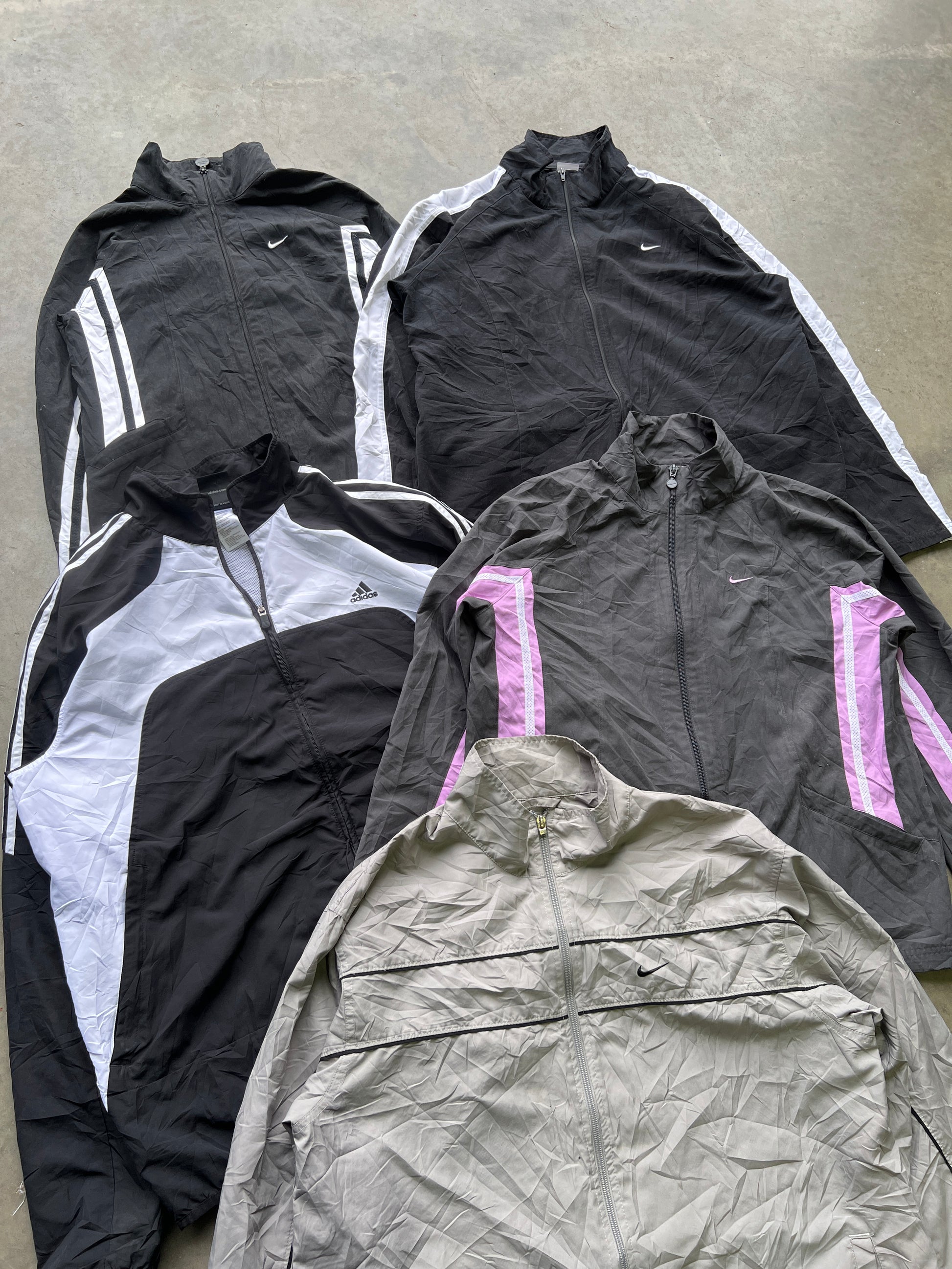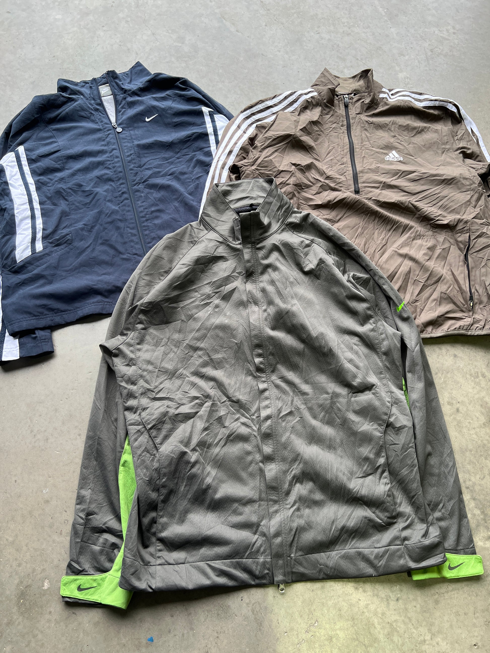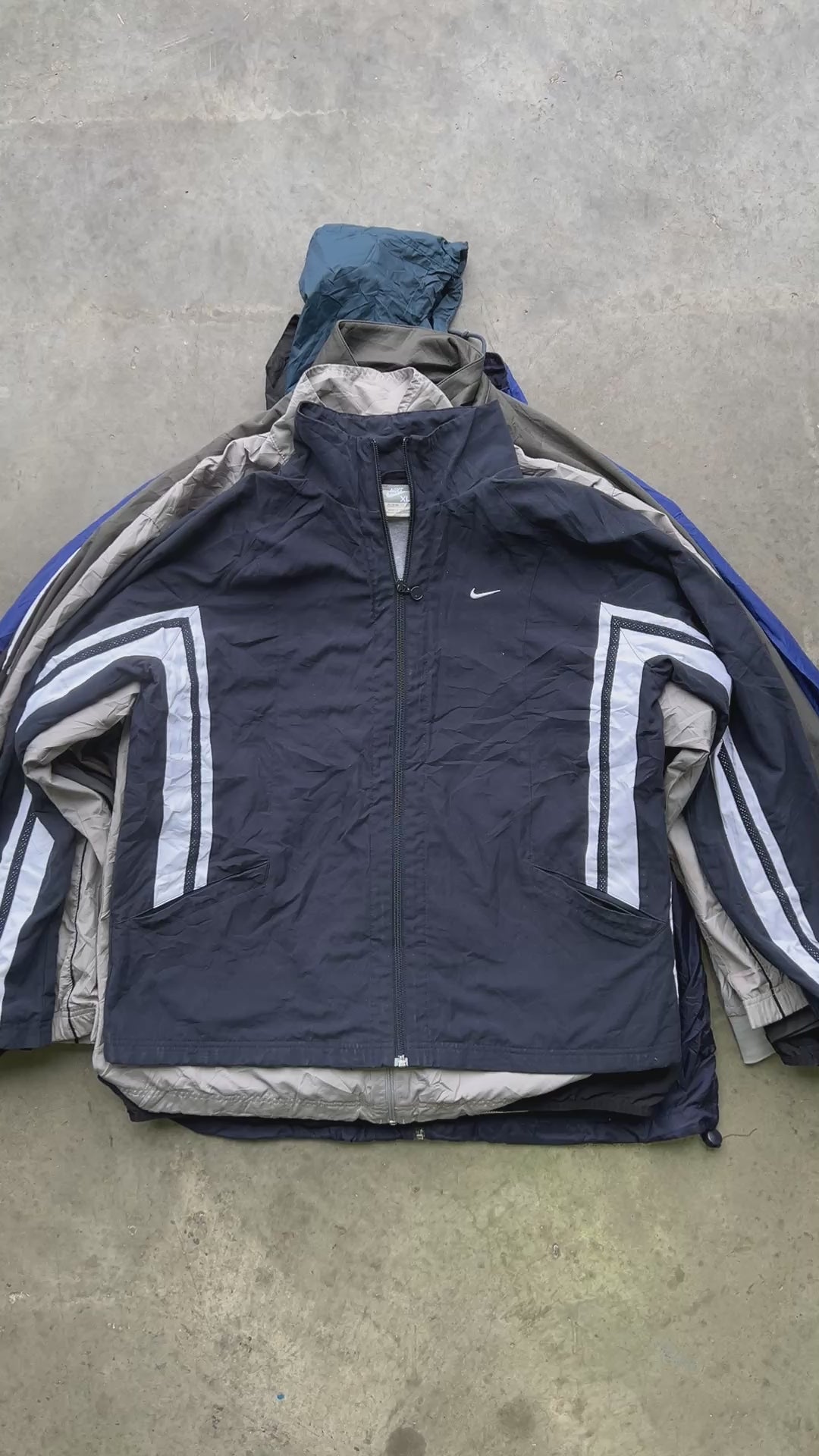 Mix of sports-branded lightweight jackets, track jackets, and sports jackets. Lots of Nike in the mix. Includes both men's and women's styles. A blend of 90s and modern pieces.