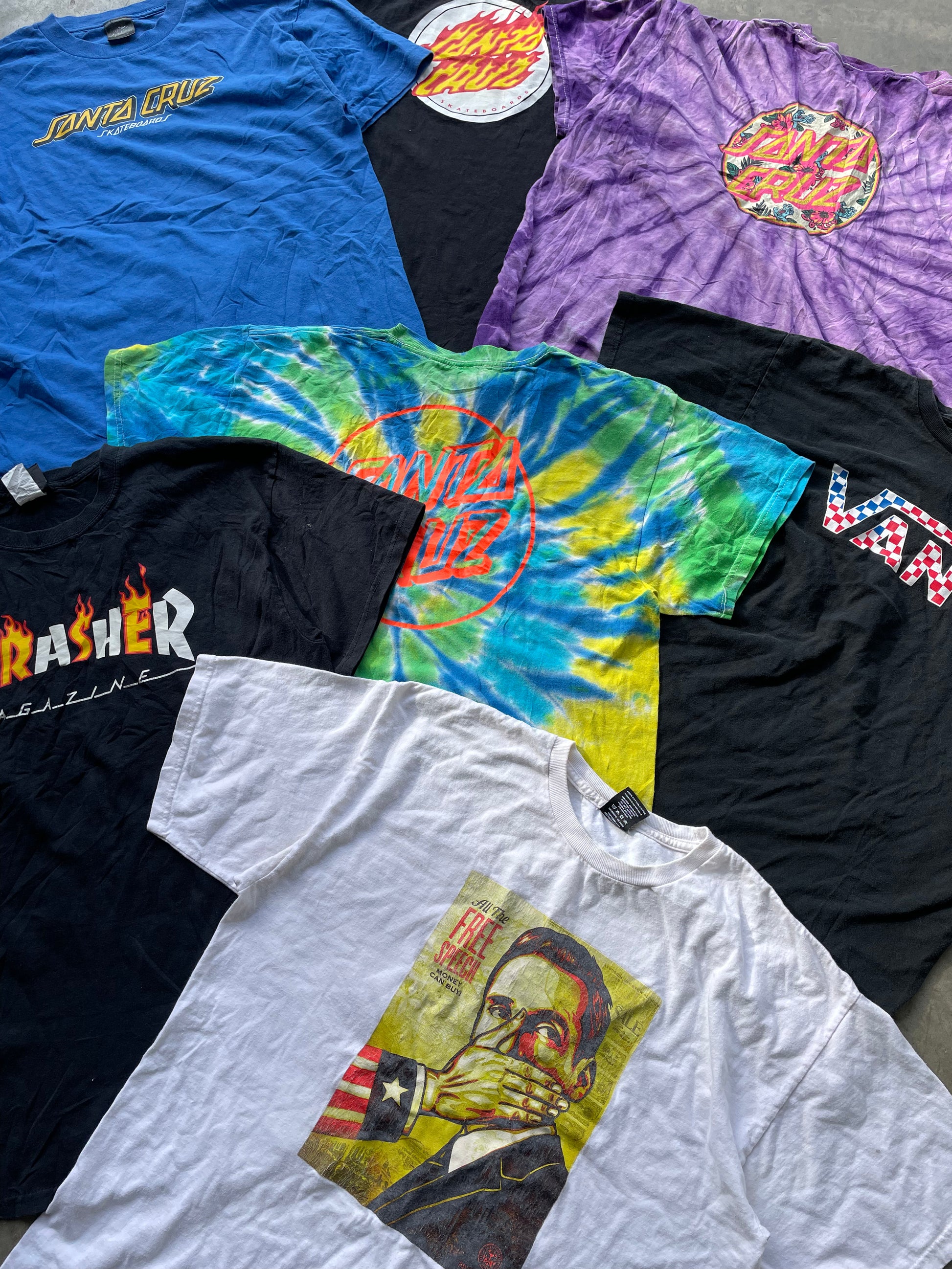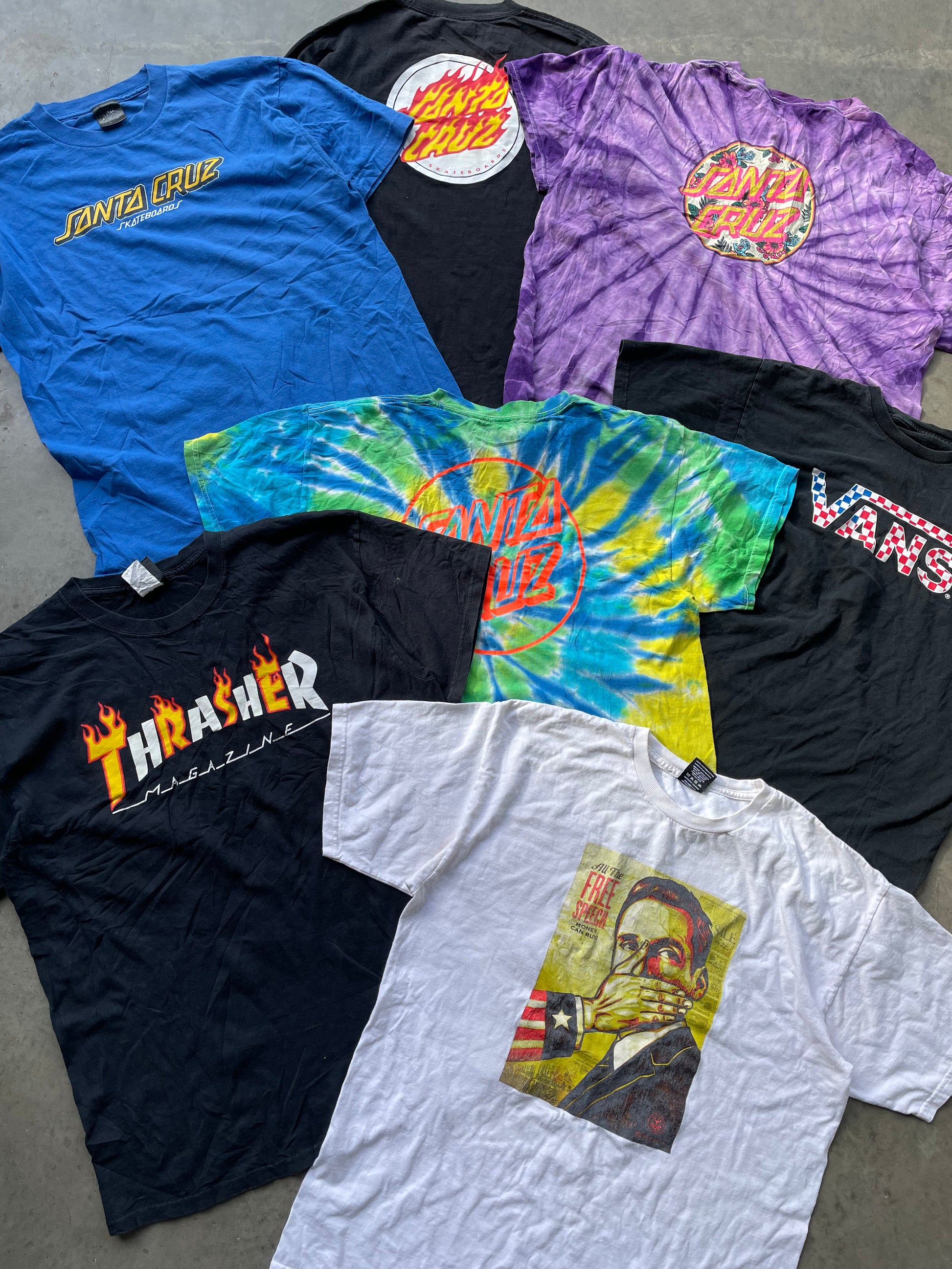 Surf & Skate branded t-shirts. Features retro/modern tees from brands such as Santa Cruz, Vans, Thrasher, Obey etc.