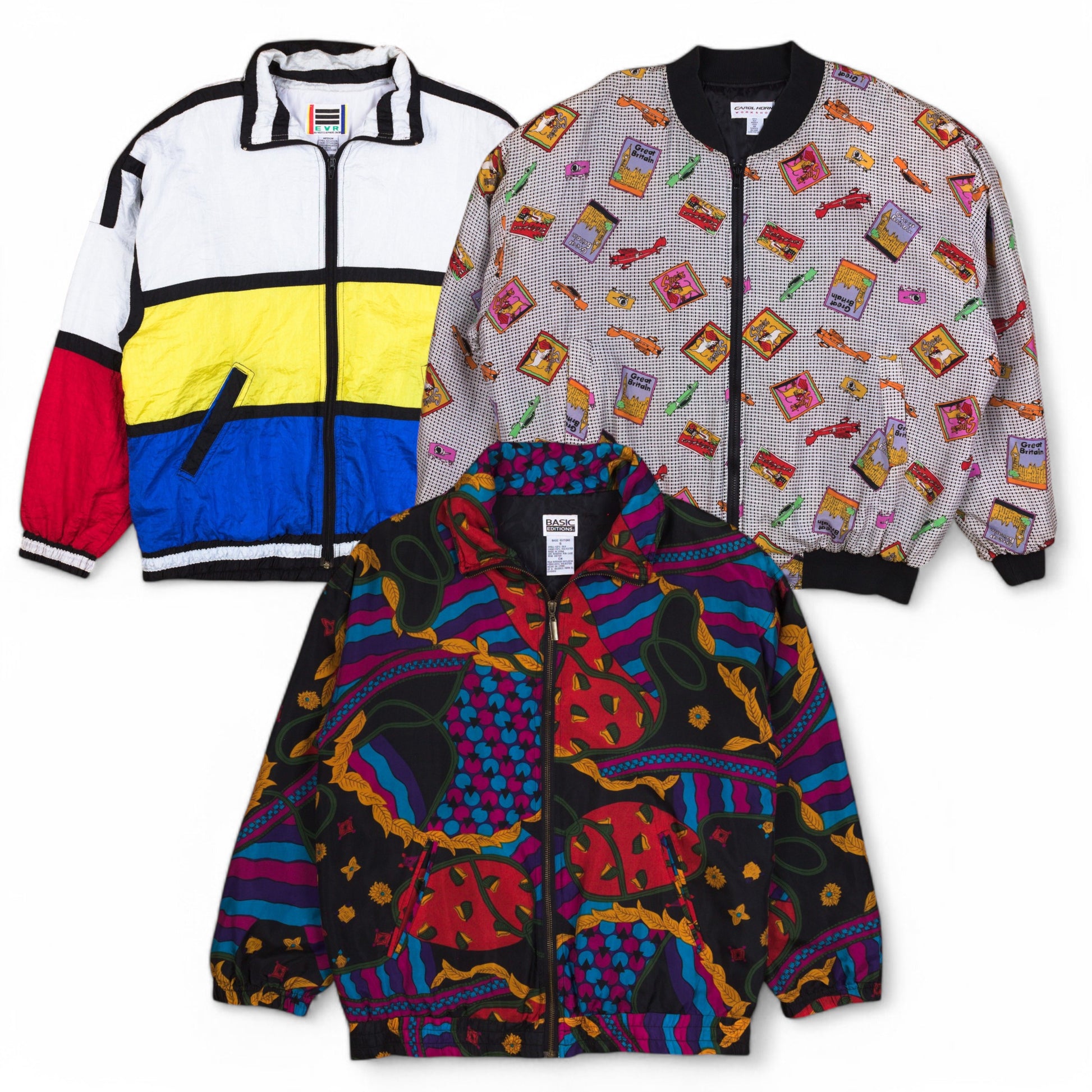 Mixed vintage satin jackets with colourful and crazy patterns. A mix of men's and women's styles — perfect for festivals and events.