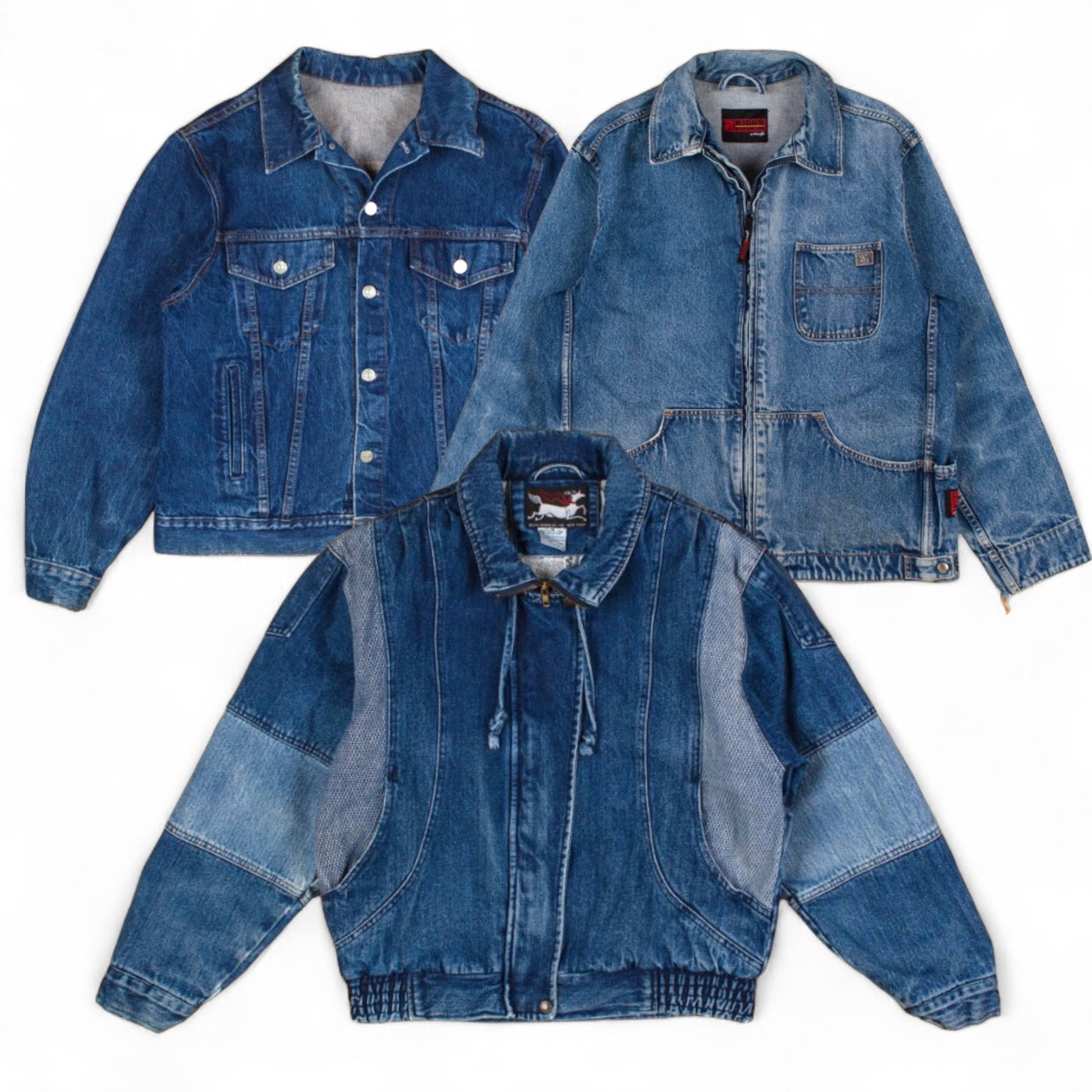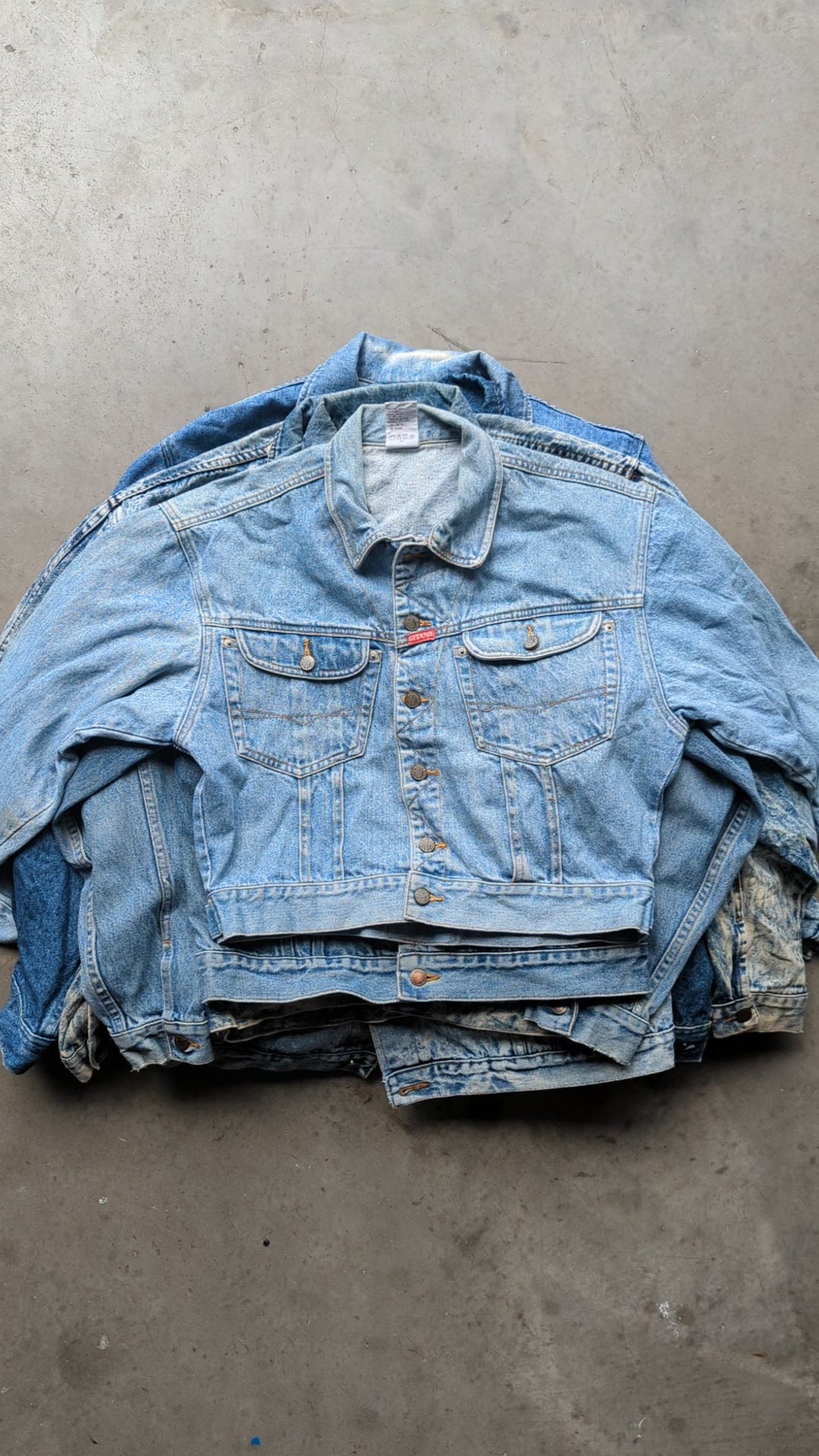 Mixed vintage denim jackets. Mostly trucker style in nice colours from the 80s to Y2K, curated grade.