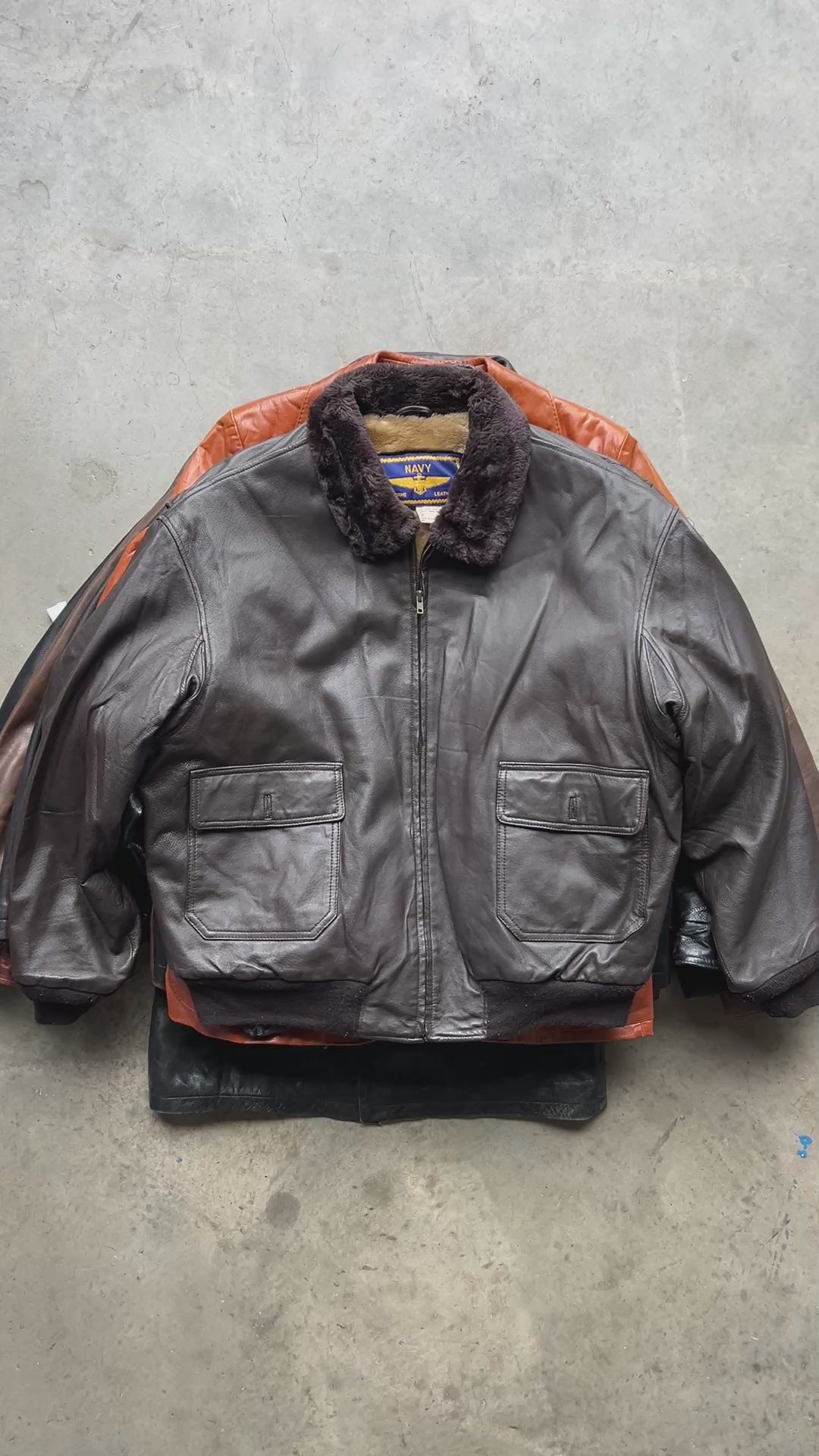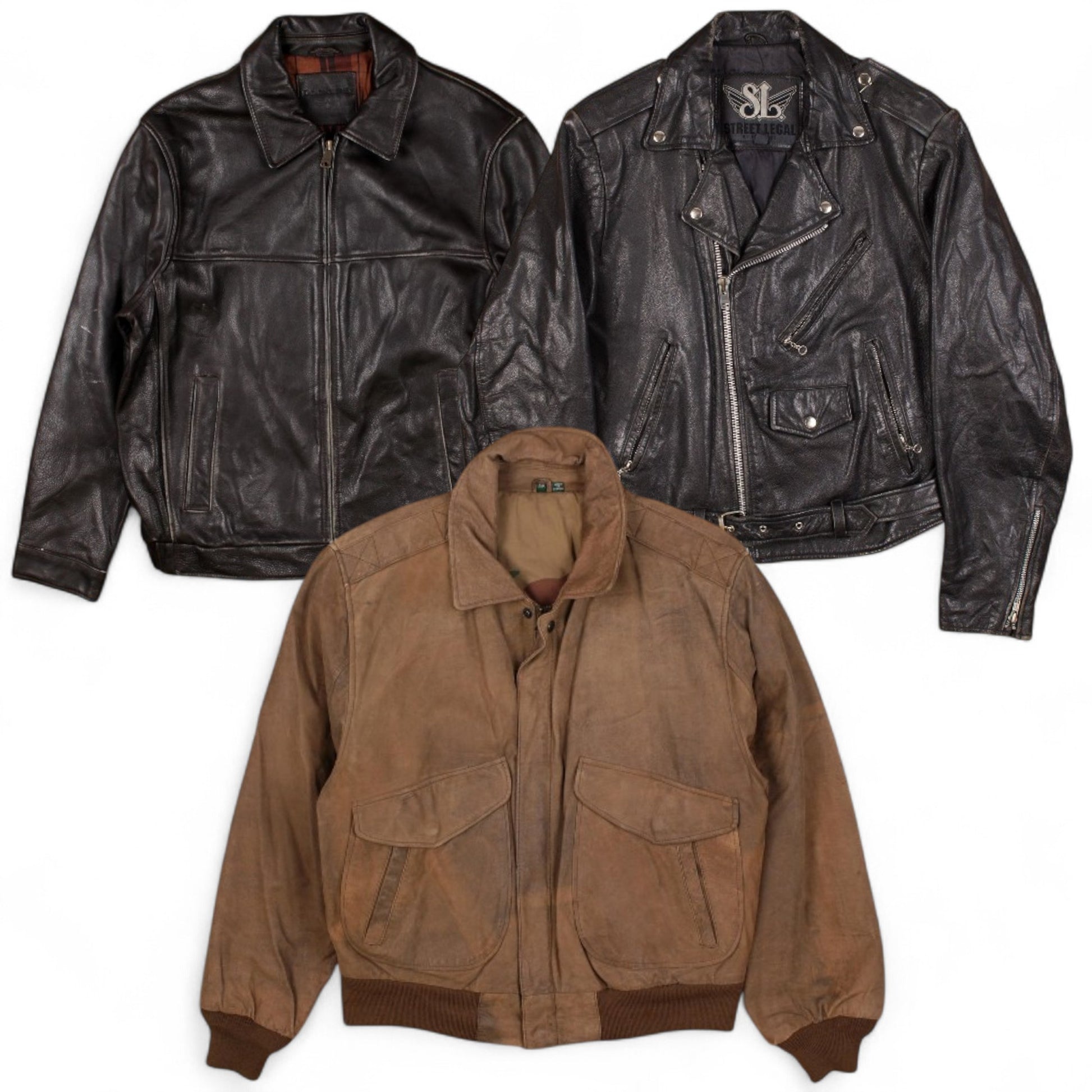 Various mens vintage leather jackets, mostly 90s/00s but with some 70s/80s vintage in the mix. Total mix of styles but all quality sellable pieces. You may find perfecto, cafe racer, biker, A2, military etc.