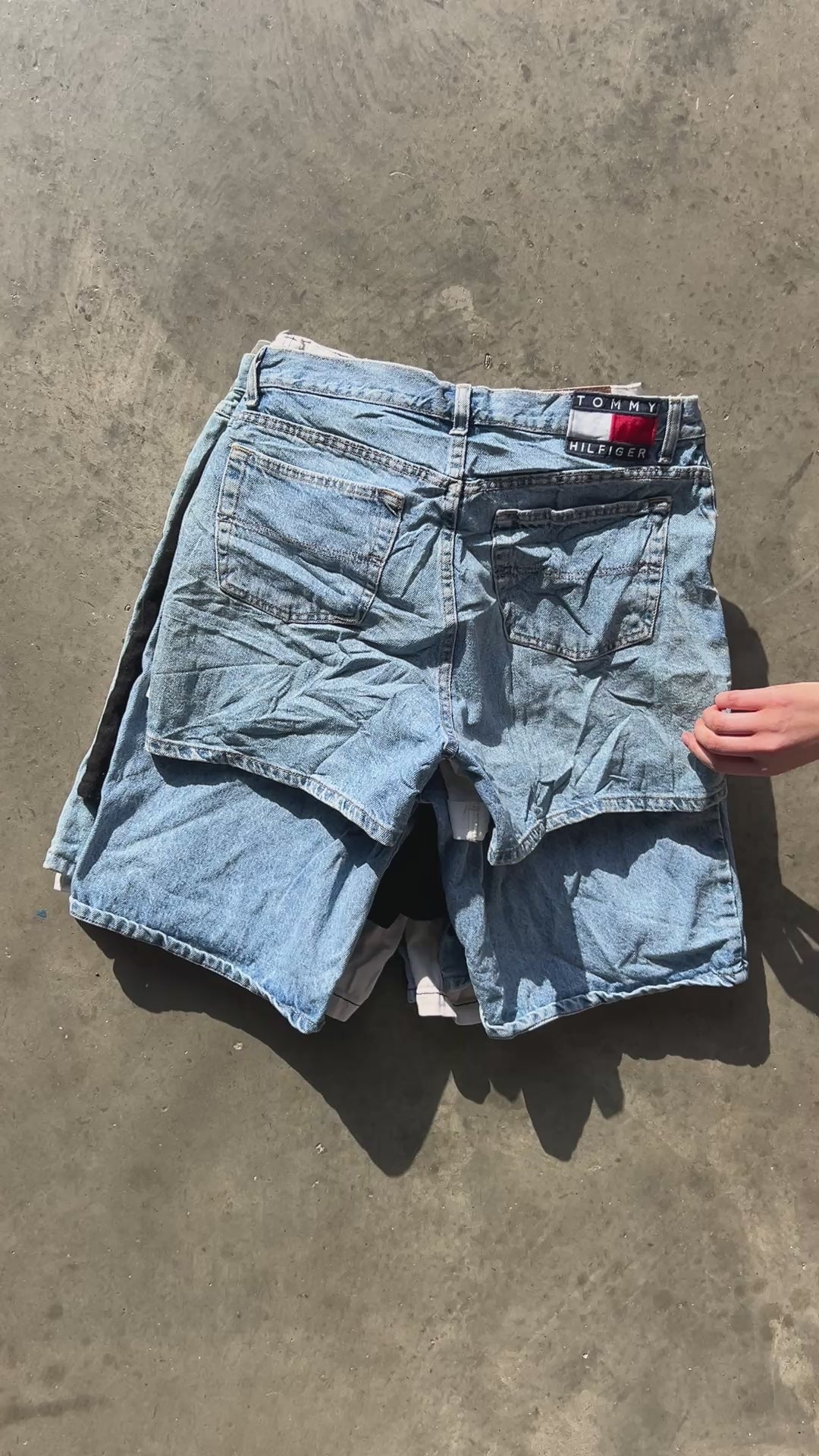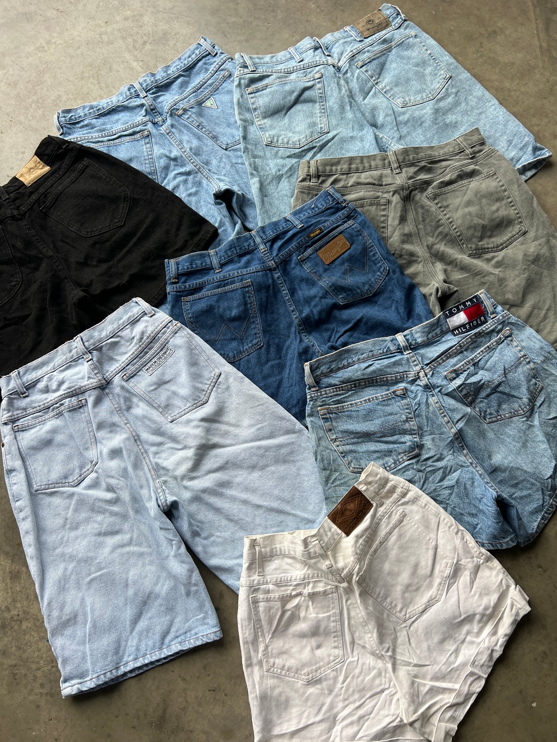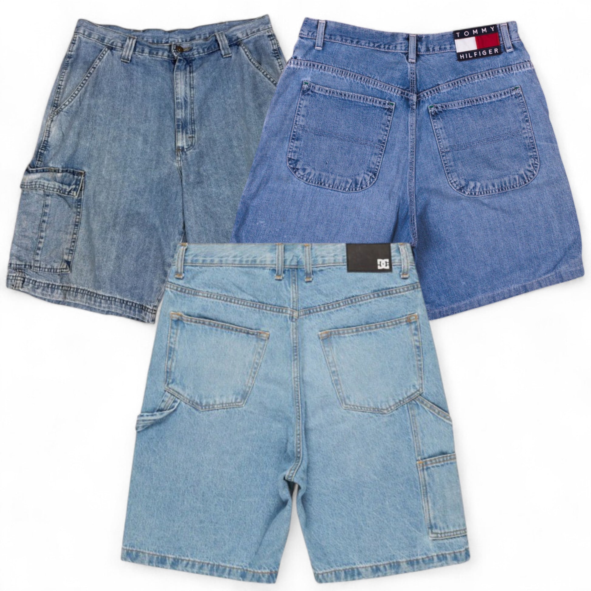 Mixed vintage denim jorts. Mix of men's and some women's. Some branded — Guess, Tommy, Nautica, Dickies, etc. — and other true vintage 80s/90s/Y2K pieces. Mostly longer and baggier, but there will be some shorter pairs in there.