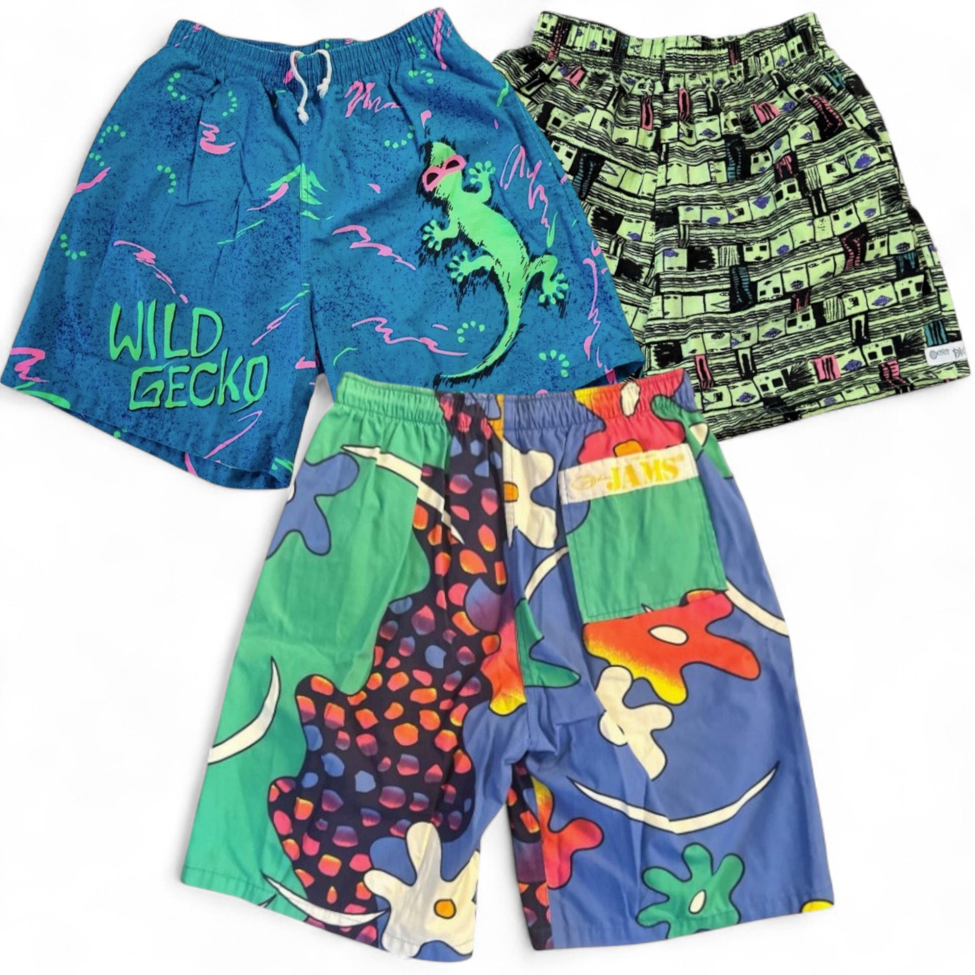 Mixed vintage surf shorts. Various lengths, colours, and patterns. All from the 80s to Y2K.