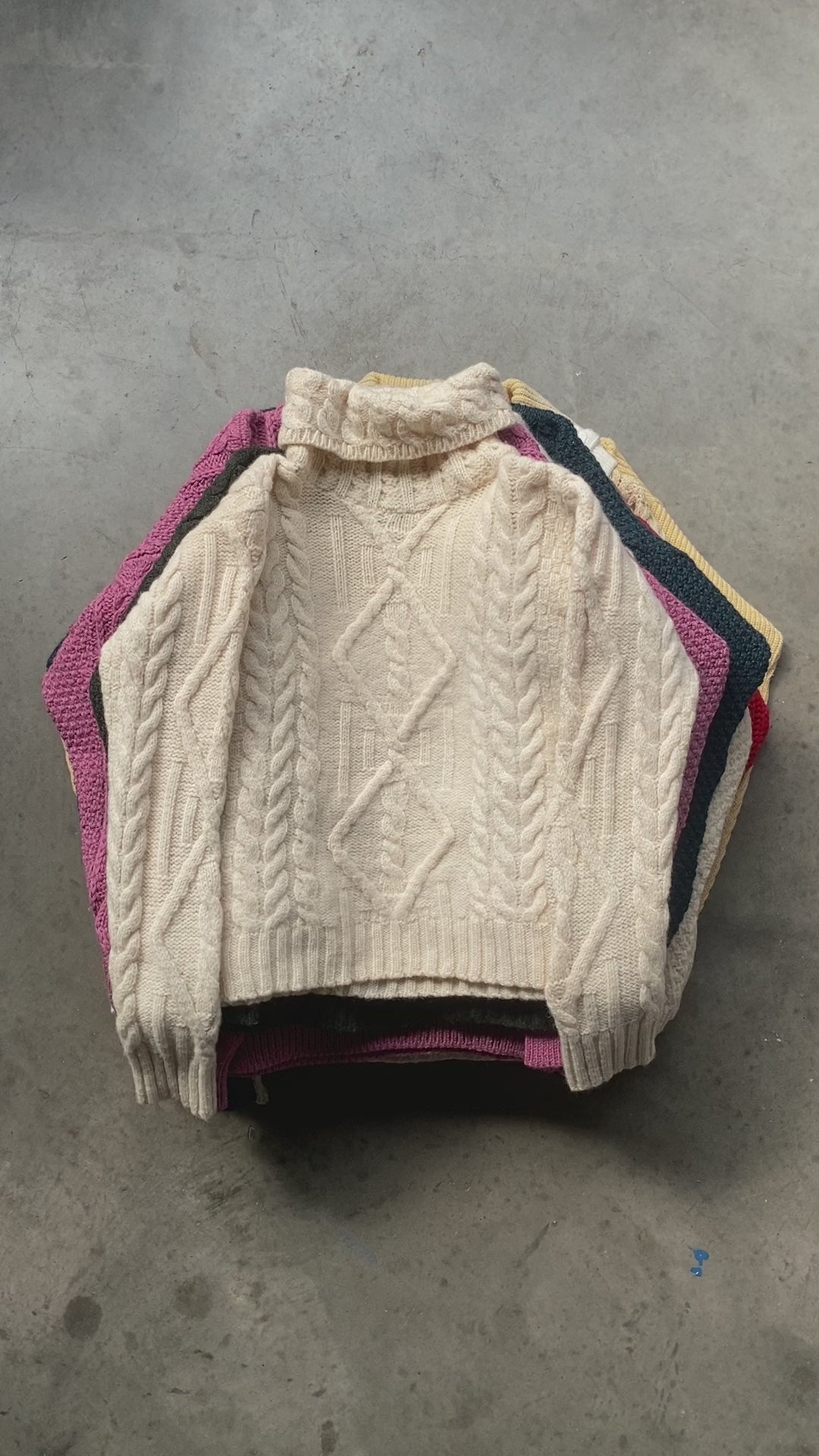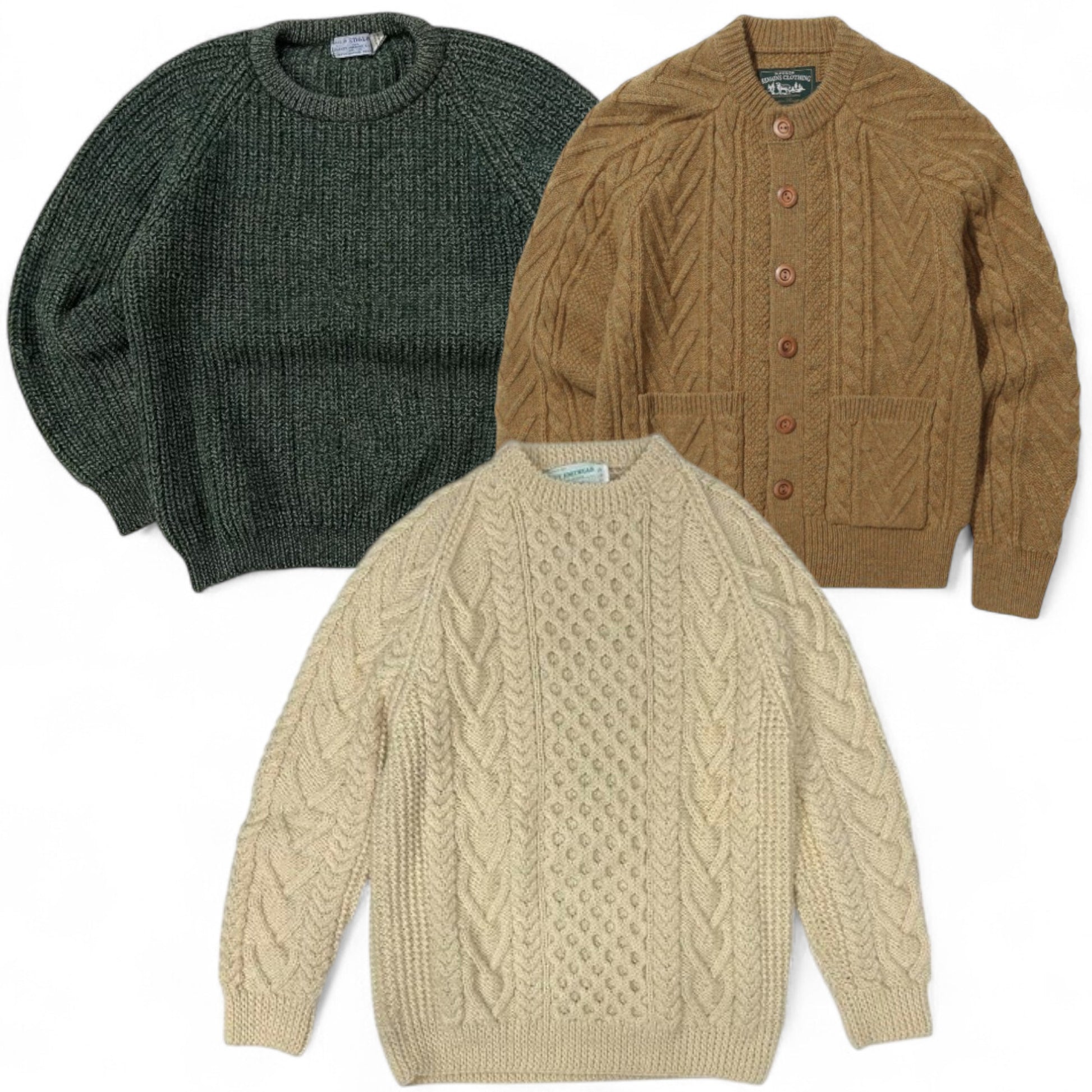 Plenty of tagged/true vintage. Heavy chunky wool sweaters and cardigans. Lots of USA and Ireland made. Mix of colours and beige type colours.