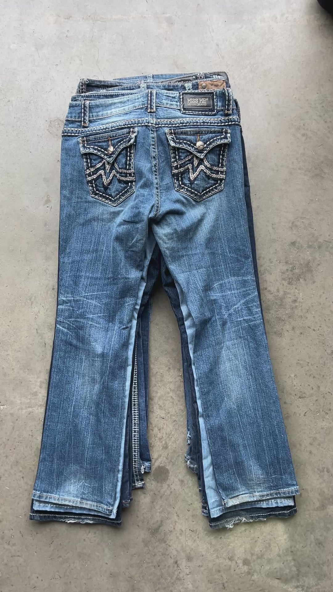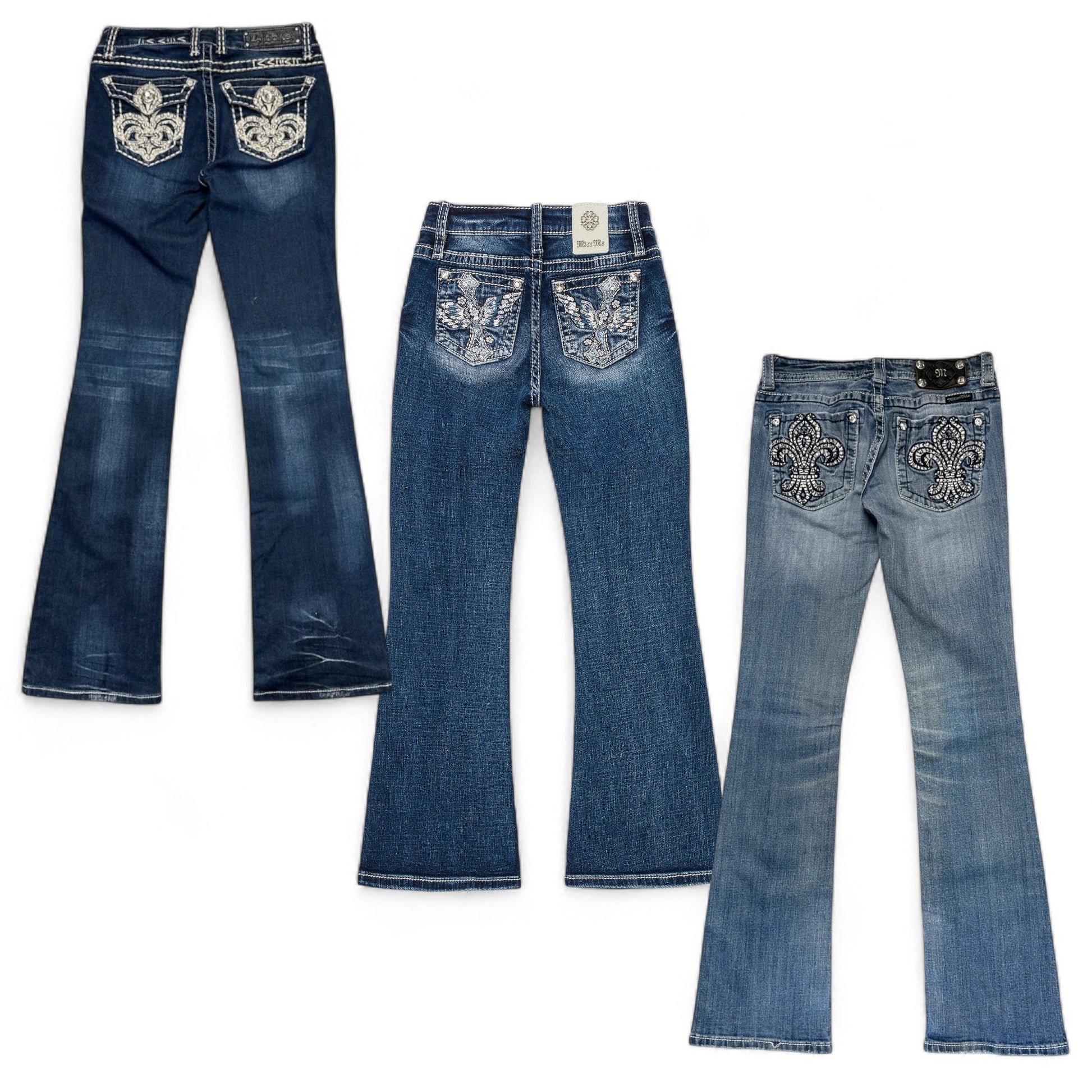 A mix of Y2K Women's jeans in the Miss Me Style, faded blues, embroidered back pockets. A mix of low rise, bootcut and slimmer/skinnier styles.